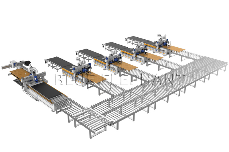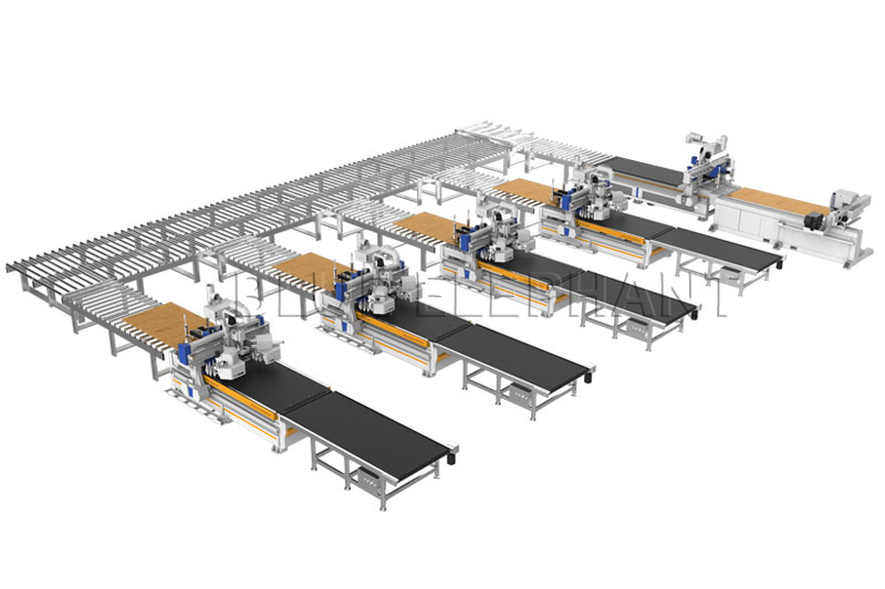 3、所有的步驟全部自動(dòng)化完成。所有板材通過中央控制器分配至各個(gè)加工中心,包括正反面的造型,鉸鏈孔,玻璃門的加工,并適用于所有的家具生產(chǎn)軟件。